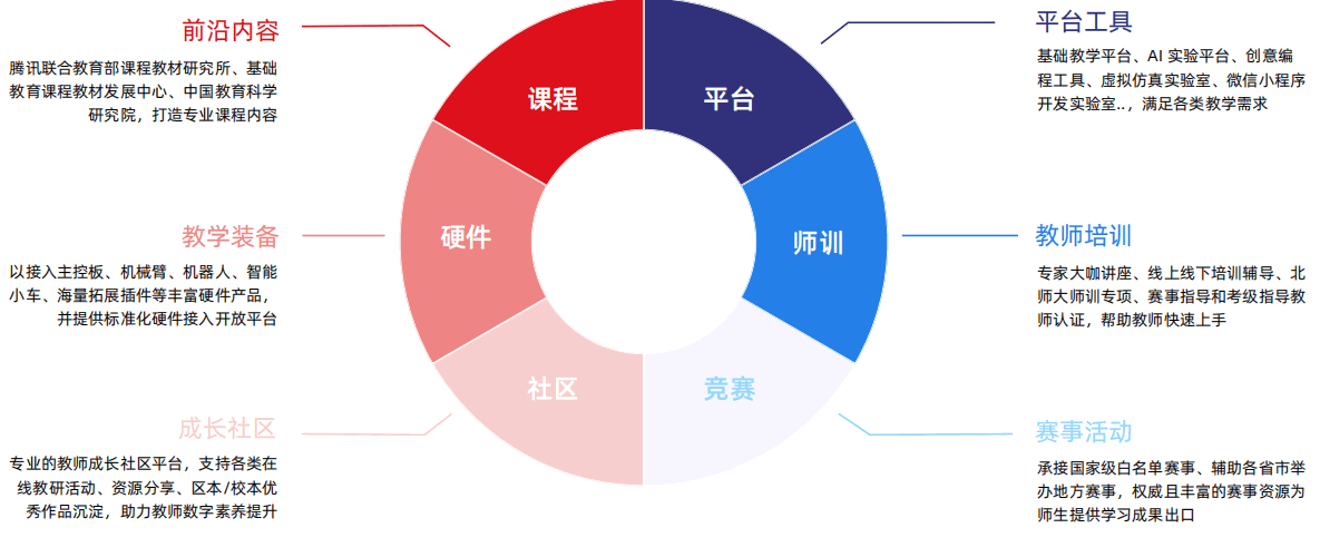 对于行业中同时具备技术、业务和渠道优势的头部企业而言,其具备强大的纵向整合能力,能够打造出融合技术、产品、服务、知识的一站式的解决方案。以腾讯教育为例,面向全国各学龄段师生提供的以人工智能课程教学为核心的整体解决方案,包括基础教学平台、 AI 实验平台、丰富编程工具、优质课程资源以及师资培训和赛事运营等内容,帮助学校/机构高效开设人工智能课程。